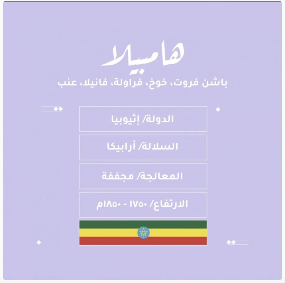 بإمكان محصول هامبيلا من أراضي أثيوبيا أن يأخذك لعالم آخر بإيحاءاته المختلفة كطعم الباشن فروت والخوخ والفراولة والفانيلا والشوكولاتة والمكسرات. يعتبر محصول هامبيلا أحد محاصيلنا الفاخرة بسبب اختلافه عن المحاصيل السائدة في عالم القهوة ولما يقدمه من أقصى مراحل الاستمتاع في التذوق عند تحضيره على طريقة نسج للقهوة المقطرة.